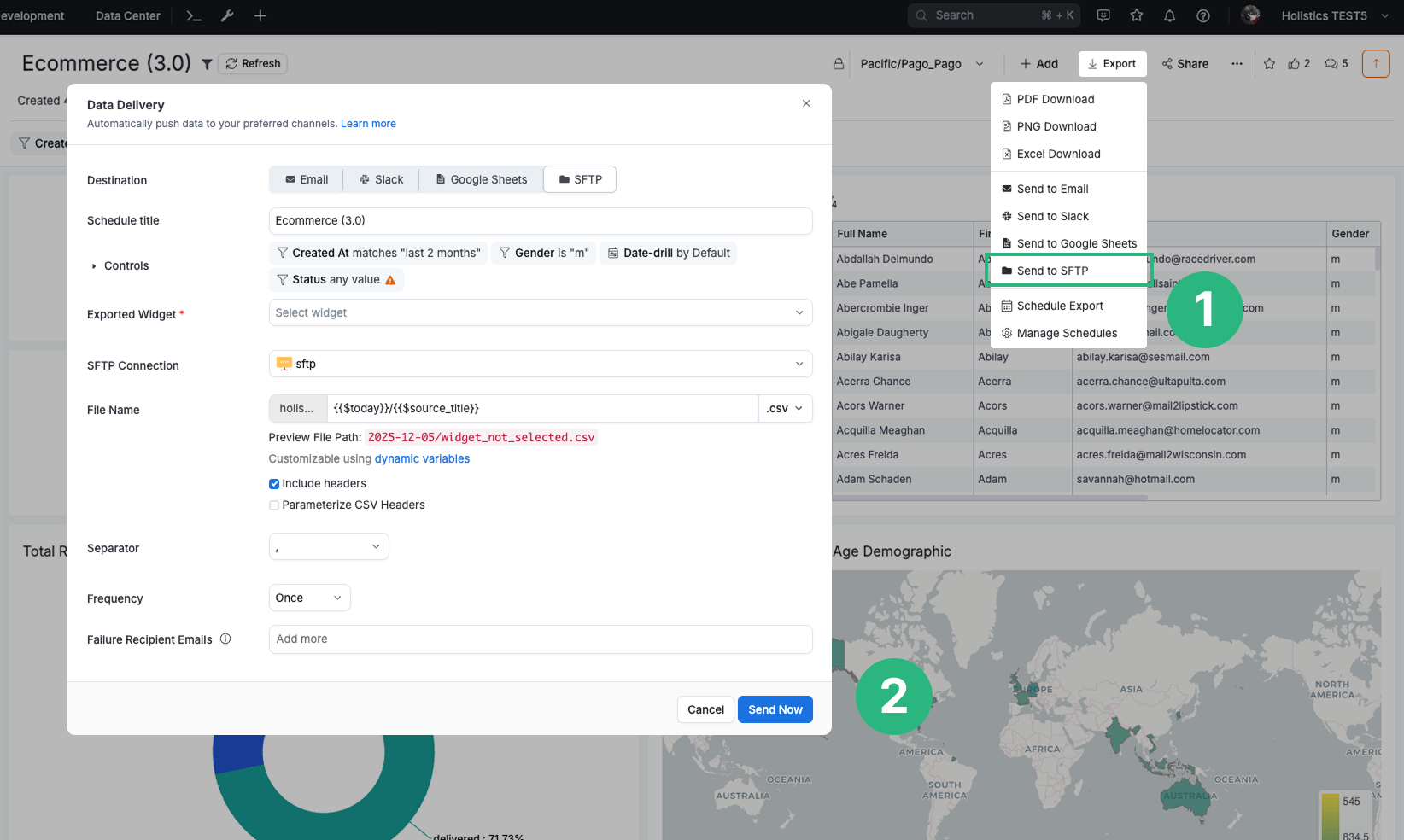 To set an SFTP schedule for a dashboard, in the dashboard view page, click on Export > Send to SFTP: